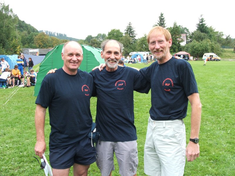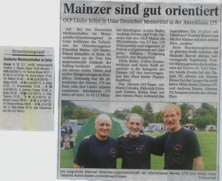 In diesem Jahr war erstmalig die Altersklasse der Herren 175 am Start, d.h. alle 3 Läufer müssen zusammen mindestens 175 Jahre alt sein. In 43:13 Minuten bewältigten Achim Bader, Andreas Dresen und Veijo Talarmo von den Orientierungslauf-Freunden Mainz die Pflichtstrecke von 3,7 km, 170 Höhenmeter und insgesamt 24 Posten und gewannen mit über 6 Minuten Vorsprung deutlich den Meistertitel. Hilde Bader, Galina Krassowitzkaja und Anne Kreft erreichten in der Kategorie der Damen 145 einen hervorragenden 2. Platz hinter Planeta Radebeul. Das Herren-145-Team mit Frank Czioska, Heinrich Götte und Torsten Kleipa kam auf den 4. Platz, während das Jugendteam (bis 18 Jahre) mit David und Thomas Klauer und Michel Kleiner auf dem 8. Platz „landete“.
